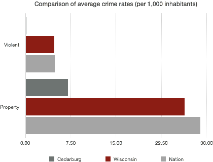 Cedarburg, a modestly sized community of 11.5K, is Wisconsin’s safest city. The city, located around 20 miles north of Milwaukee, logged a mere 3 violent crimes in 2018, which adds up to a violent crime rate of 0.26 per 1K.