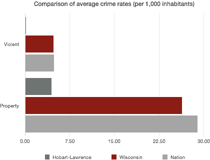 Next on the list is the Fox Valley Metropolitan area, which comprises a number of small communities based along the Fox River. With a violent crime rate of 0.73 per 1K, and a property crime rate of 3.73 per 1K, Fox Valley metro residents can be well assured of their safety.