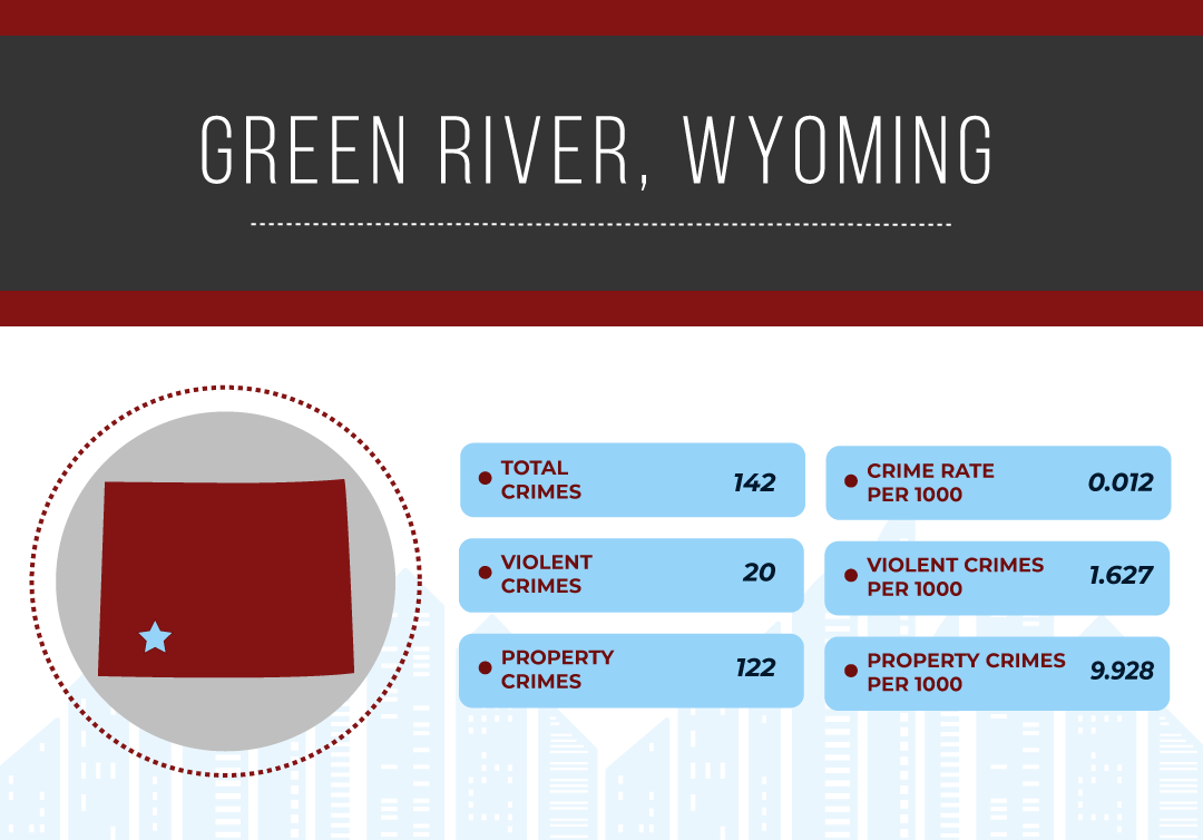 Wyoming’s safest community is Green River, a small city of about 12K located in Sweetwater County in the southwest part of the state. Green River logged just 14 violent crimes in 2018, good for a violent crime rate of just 1.16 per 1K, and it’s property crime rate of 8.48 per 1K is the lowest in the state.