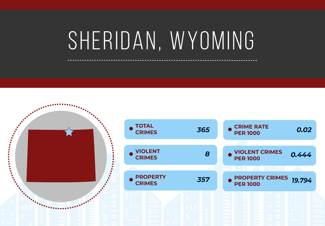 Rounding out the list of Wyoming’s top five cities are Sheridan (#4), a city of nearly 18K positioned halfway between Yellowstone Park and Mount Rushmore with a violent crime rate below 1 per 1K, and Evanston (#5), a small city of about 12K near the Utah border that recorded a mere 11 violent crimes in 2018.