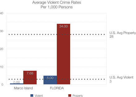 #3 Marco Island has a lot in common with Key Biscayne: both are tourist-frequented island communities where crime is scarce. Marco Island’s violent and property crime rates are even lower than those of the prior entry’s, yet the city falls slightly due its lower law enforcement-to-residents ratio.